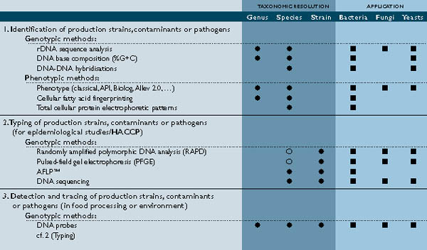 The introduction of molecular biological techniques has also yielded a variety of DNA-based typing methods, which can even discriminate between isolates of a given species. These data can be used for epidemiological purposes and may provide insight into the dissemination and persistence of spoilers and/or pathogens in the environment. Discrimination between coincident but independent infections and epidemics caused by a single isolate is a major concern, which affects the preventive and hygienic measures to be implemented. Genetic typing methods can be divided into different categories depending on the technical aspects: DNA sequencing, restriction endonuclease analysis of plasmid or genomic DNA (e.g. RFLP, PFGE), probe-based technologies and PCR-based technologies (such as RAPD, AFLPTM). These methodologies can be developed and adapted by BCCMTM, according to the specific requirements of the food industry (see table).