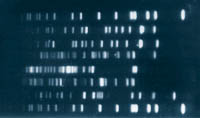 ![]() PFGE - Pulsed-field gel electrophoresis (PFGE) is the most discriminatory DNA-based typing method. Intact chromosomal DNA is isolated in situ, employing agarose plugs and is digested with infrequently cutting restriction endonucleases. Large genomic fragments are separated by cyclically altering the orientation of the electric field during electrophoresis. Macrorestriction genomic fingerprinting by PFGE is an indicator of clonal origin of strains. One of its uses is the identification and tracing of starter strain(s) during food manufacture, to detect contamination sites of spoilage organisms during processing (HACCP), or to check the authenticity of proprietary strains. Lanes 1 and 8, molecular weight marker DNA (Staphylococcus aureus); lanes 2, 3 and 7, Enterococcus durans strains of different clonal origin; lane 4, Enterococcus hirae; lane 5, Enterococcus flavescens; lane 6, Enterococcus faecium. |